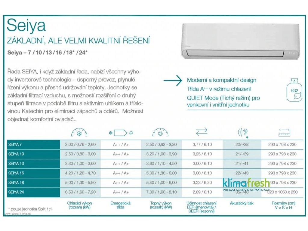 Toshiba Seiya prináša moderné technológie a prémiový dizajn, ktorý spája účinnosť, energetickú úsporu a pokročilé funkcie v kompaktnom modeli vhodnom pre priestory do 25 m².